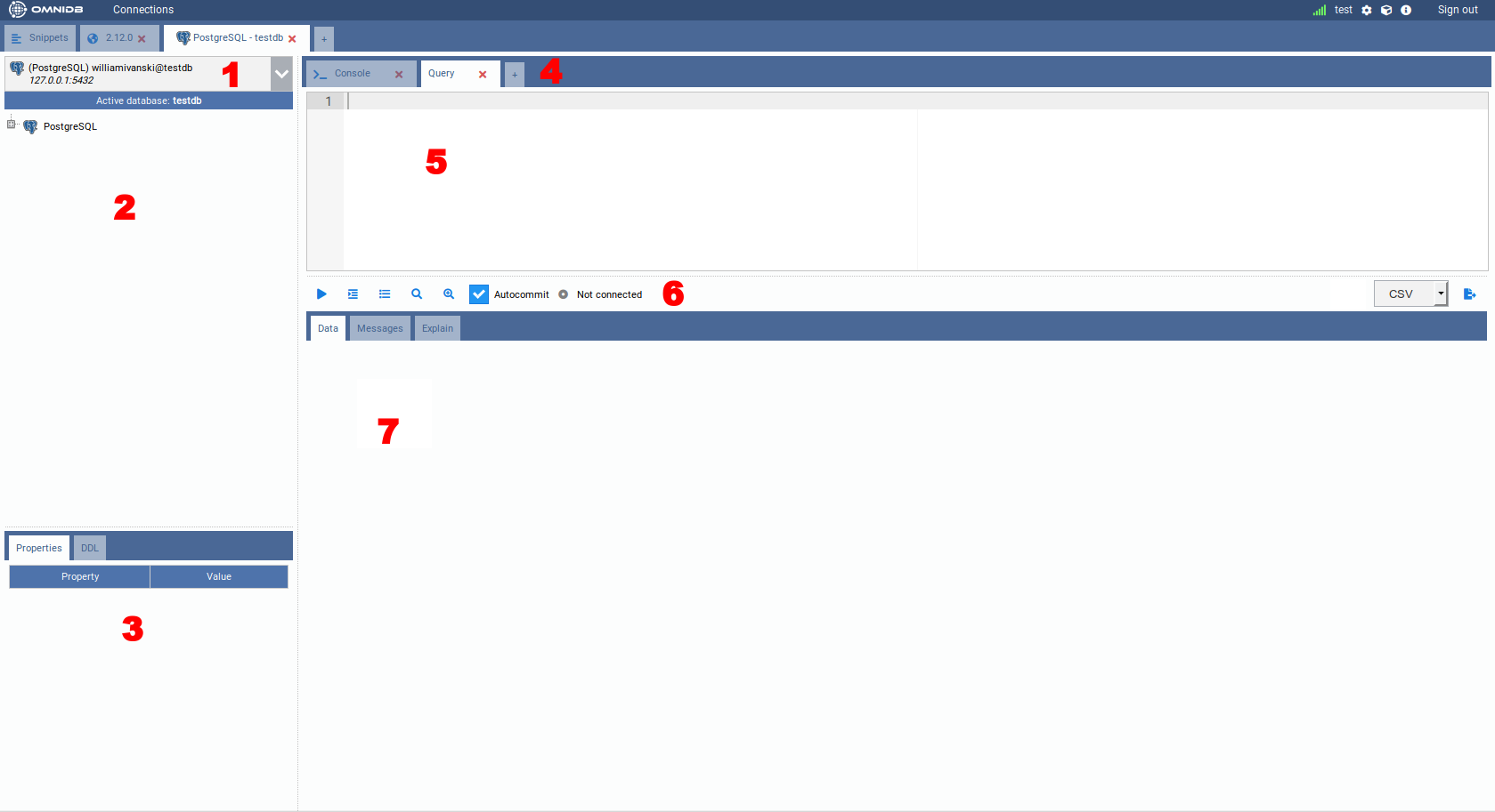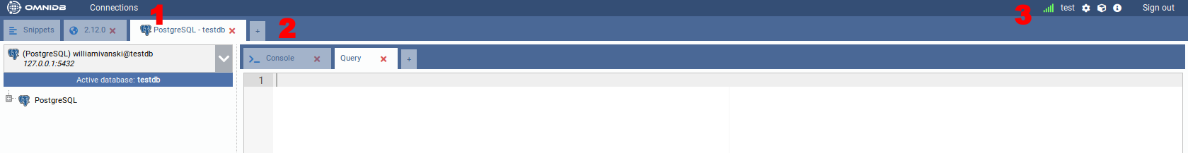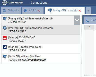 - 2) Outer Tabs: OmniDB lets you work with several databases at the same time. Each database will be accessible through an outer tab. Outer tabs also can host miscellaneous connection-independent features, like the Snippets feature