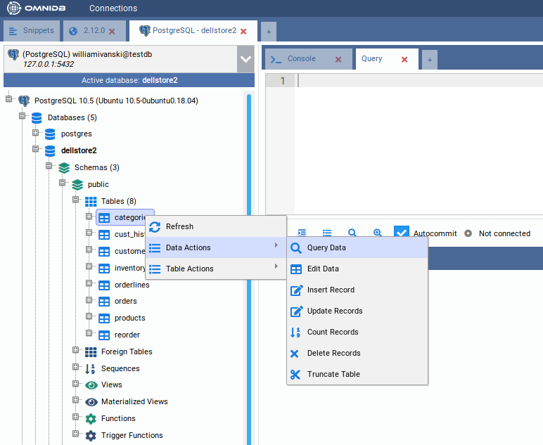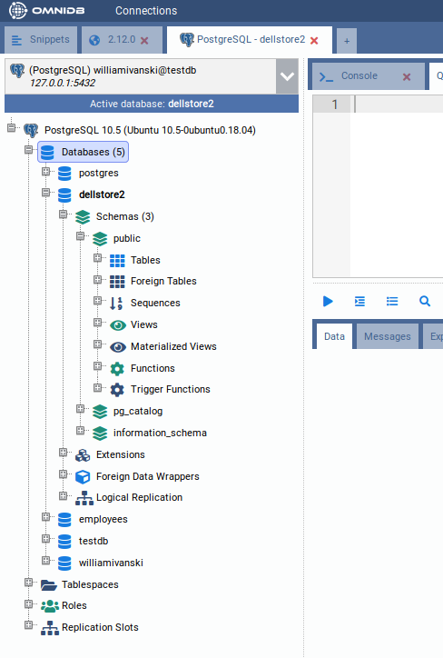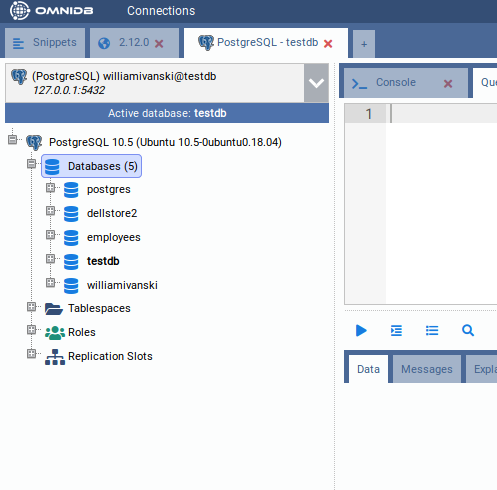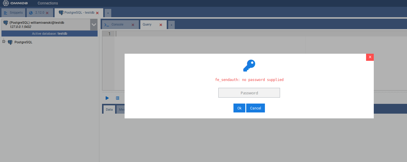 Bear in mind that every 30 minutes you keep without performing actions on the database, will trigger an Authentication popup, meaning that the password that OmniDB has encrypted and stored in memory is now expired. As explained before, this is important for your database security. After you type the correct password, you will see the PostgreSQL node now shows the PostgreSQL version and also was expanded, showing the current database connection and also instance wide elements: Databases, Tablespaces, Roles and Replication Slots.