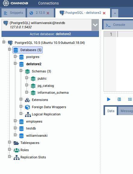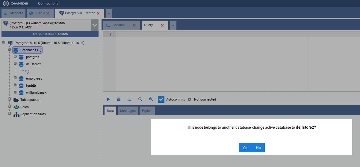 Click on Yes and OmniDB will change the active database to the database you choose. It will be reflected on the Active database indicator, and also on the outer tab name.