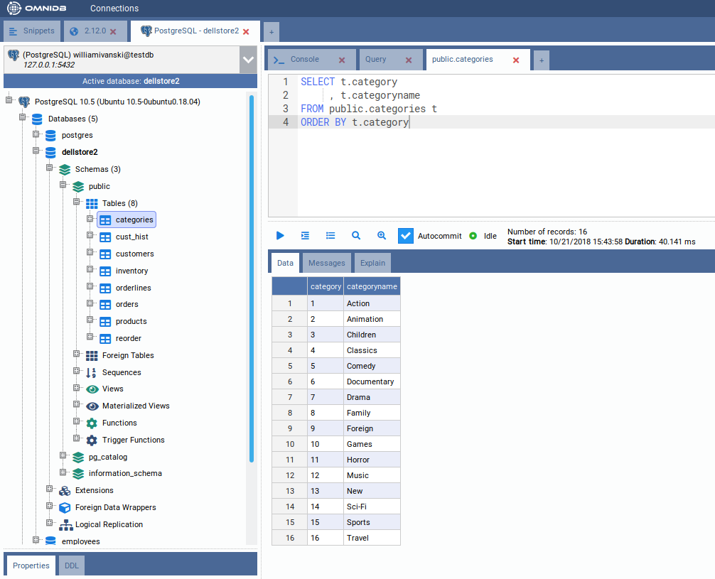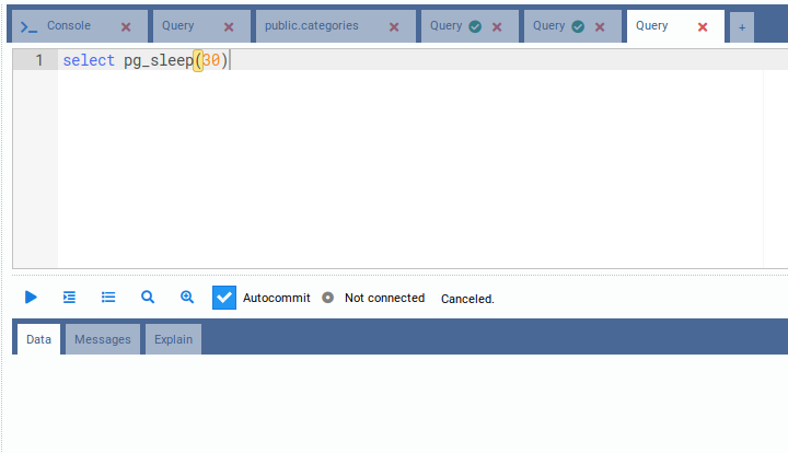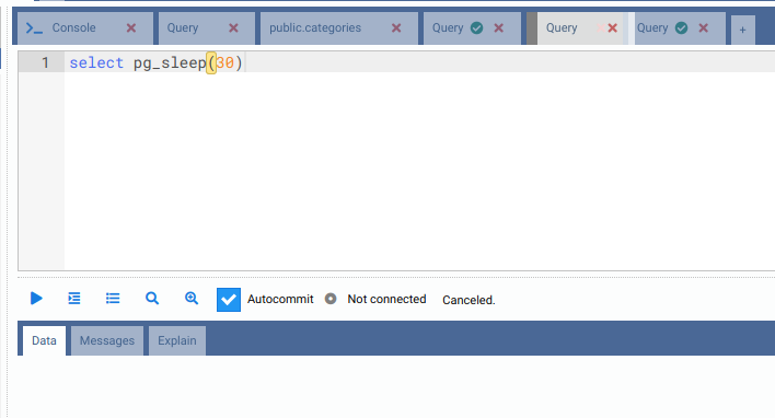 Alt-Q), will show a grid with the query results in the Data subtab. If the query calls a function that raises messages, those will be shown in the Messages subtab. If instead of Run you clicked in Explain or Explain Analyze, the explain plan for the query will be shown in the Explain subtab.