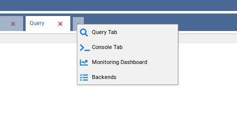 - 4) Inner Tabs: Allows the user to execute actions in the current database. There are several kinds of inner tabs for the current database. By clicking on the last small tab with a cross, you can add a new tab. A new tab can be a Query Tab, Console Tab, Monitoring Dashboard or Backends