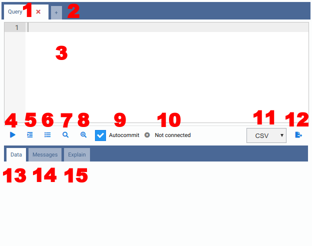 - 10) Backend Status (PostgreSQL only): When you open a new Query Tab, the status is "Not Connected", because OmniDB didn't start a PostgreSQL backend yet. When you execute the first query, OmniDB starts a new backend and keep it linked to the Query Tab (each Query Tab will be assigned its own backend). The status of the backend (idle, active, idle in transaction, etc) will be shown in this field. When you close the Query Tab, OmniDB terminates the backend.