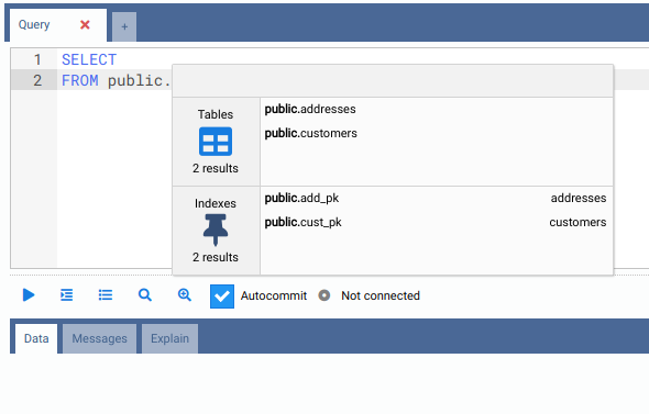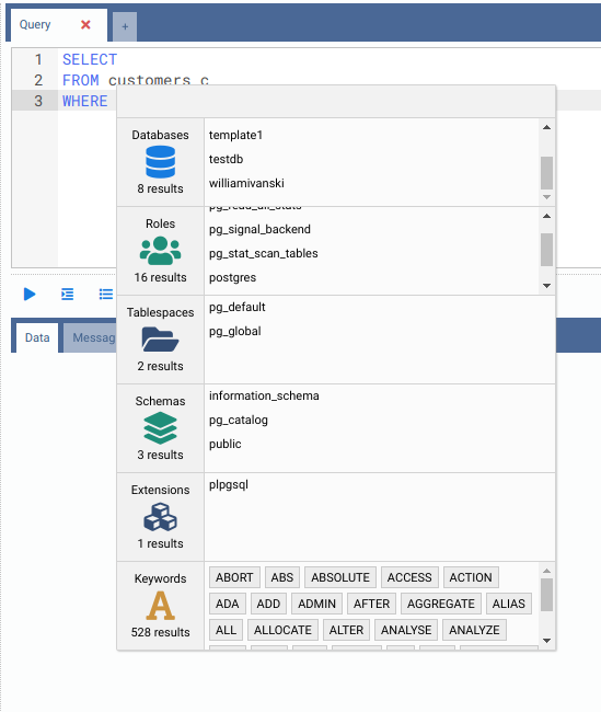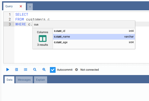 Please note that for RDBMS other than PostgreSQL, the autocomplete component only works for table columns.