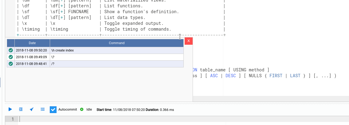 All commands also are logged in the connection query history, and also in a local console history, which you can by clicking in the Command History button.