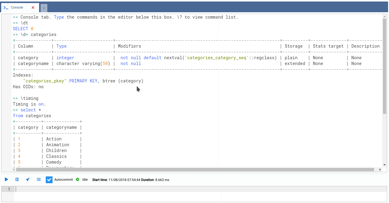 fact, many of the backslash commands Console Tab provides are present in psql.